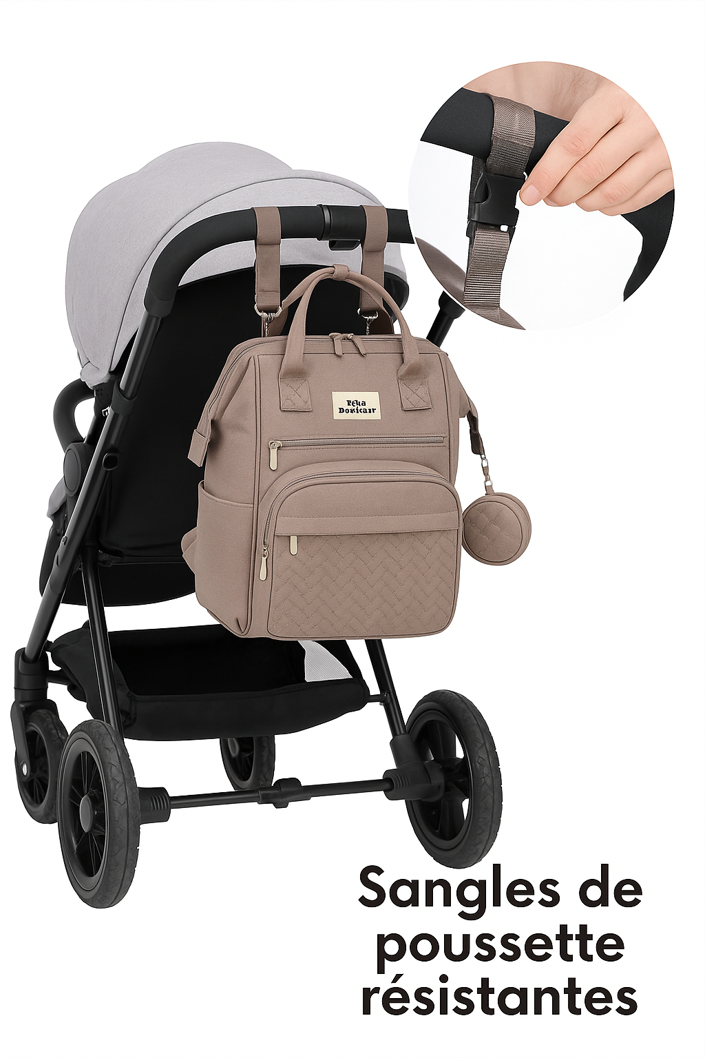Grâce à ses sangles poussette intégrées et son ouverture large, accédez à tout d’une seule main.