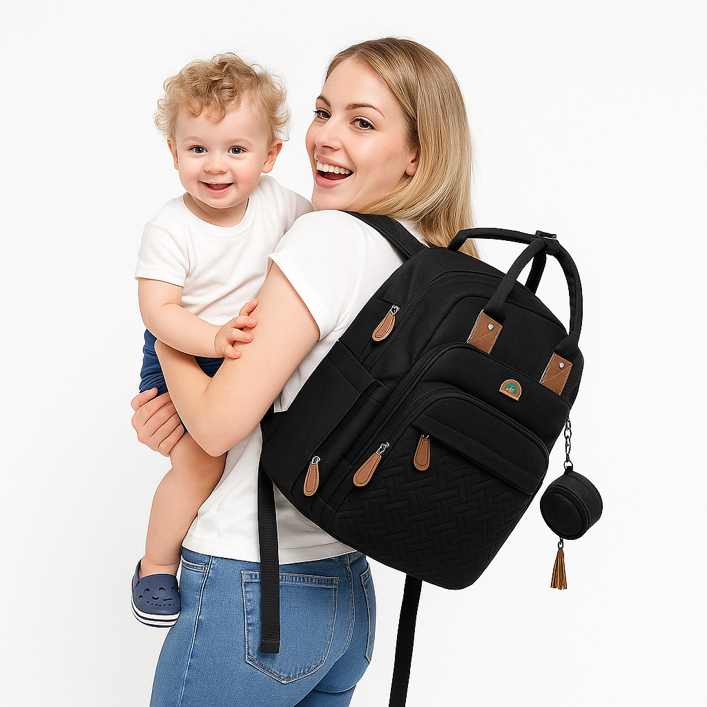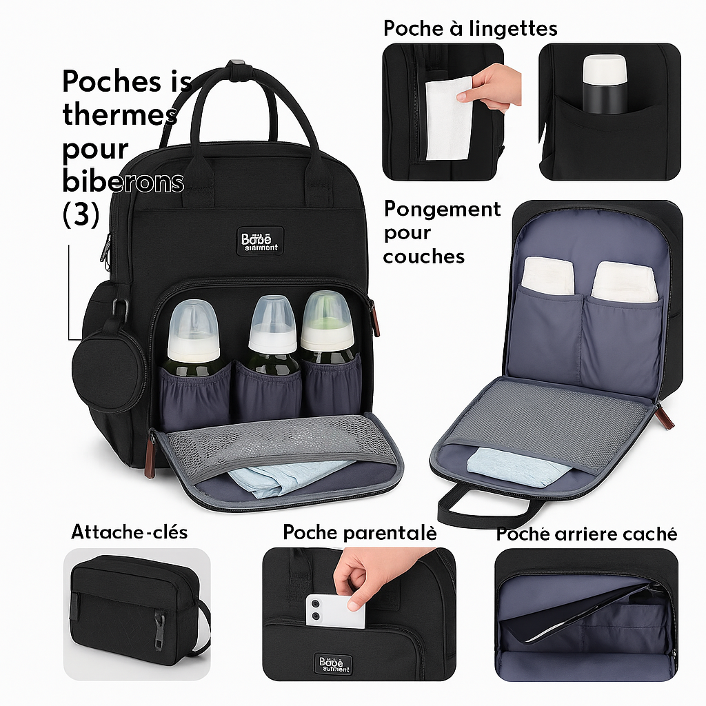 Avec 18 poches bien pensées, un porte-sucette, un tapis à langer et plus encore.